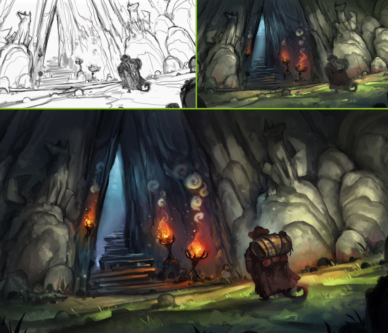 In this three part series, John Thacker shows his complete process of creating a fantasy environment with a single character. This tutorial starts with a very simple sketch and explores the steps and choices to refine the design through quick line art, layout of values for balanced, eye catching abstract appeal, and how to keep things simple and understandable during the refinement passes.