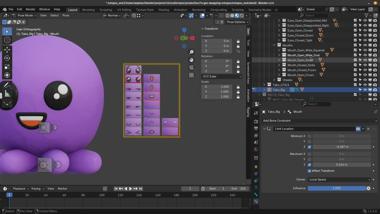 I appreciated the many tricks that become available by rigorously separating deformation and mechanism bones. It was my first time opening the Driver Editor creating custom drivers with adapted response curves. This opened a new world for me.