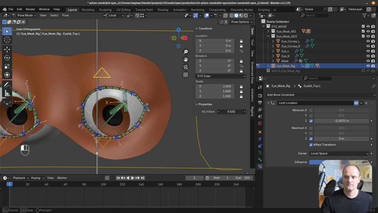 You’ll learn how to rig classic clamshell-style eyes, use shape keys for blinking, and create a 2D Grease Pencil eye rig. The final project dives into using the action constraint for an advanced eye setup.