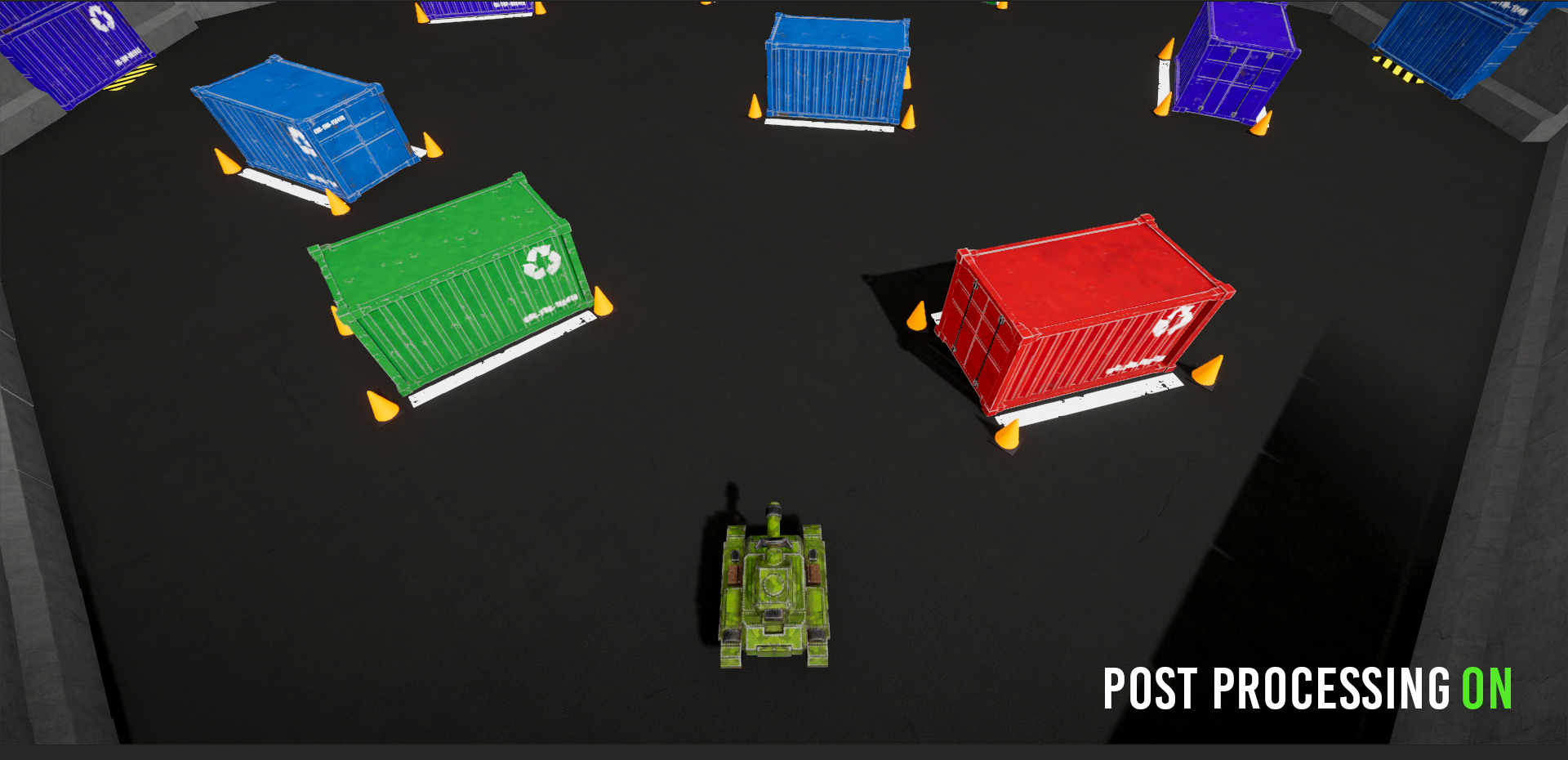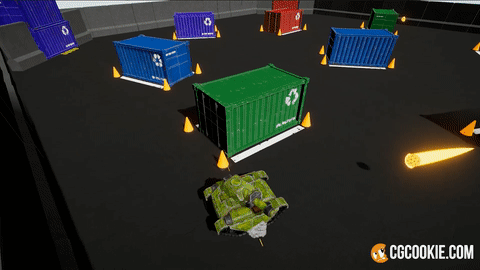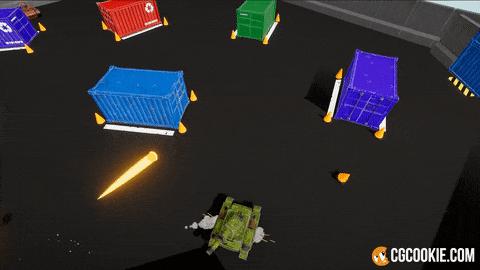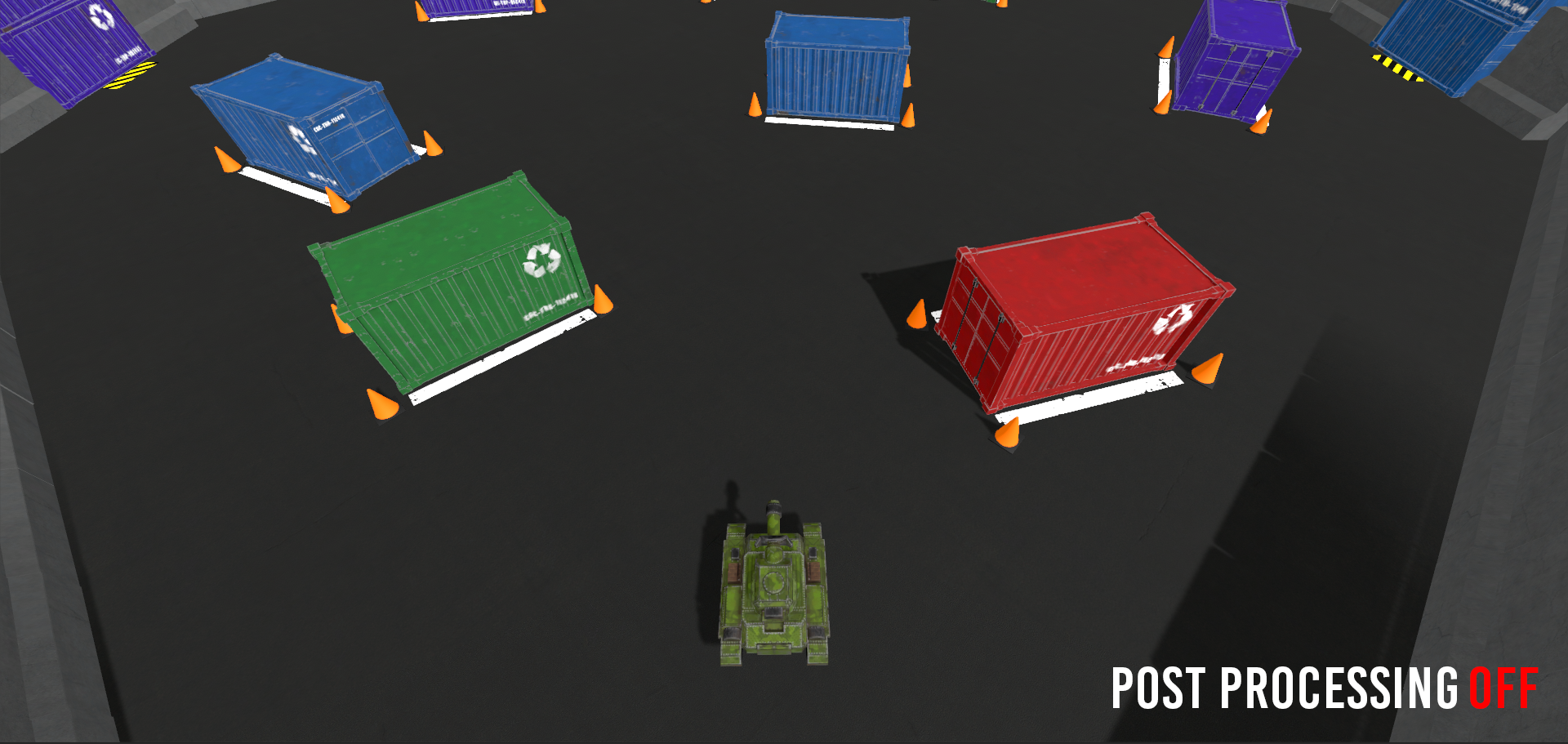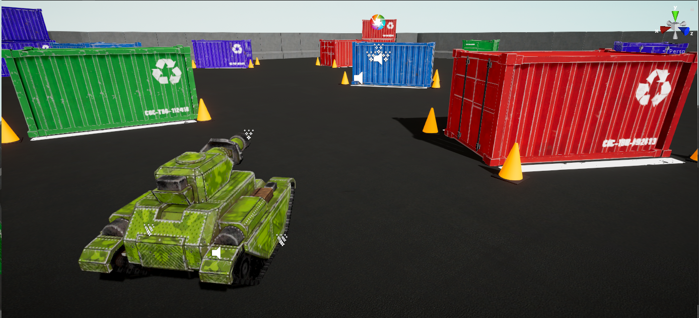 It started off with simplistic, flat looking models then evolved into a full on military base. Eventually I landed on what we have now in the game which was just to include basic props for a shipping container and concrete barriers with some cones added in for a little flair. The containers acted as cover and also objects that projectiles could ricochet off of. They were angled to ensure projectiles didn't bounce back straight into the tank that fired them.