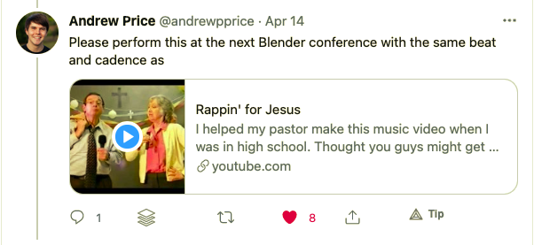 ...these lines got a chuckle out of Blender Guru, who weighed in with a musical recommendation