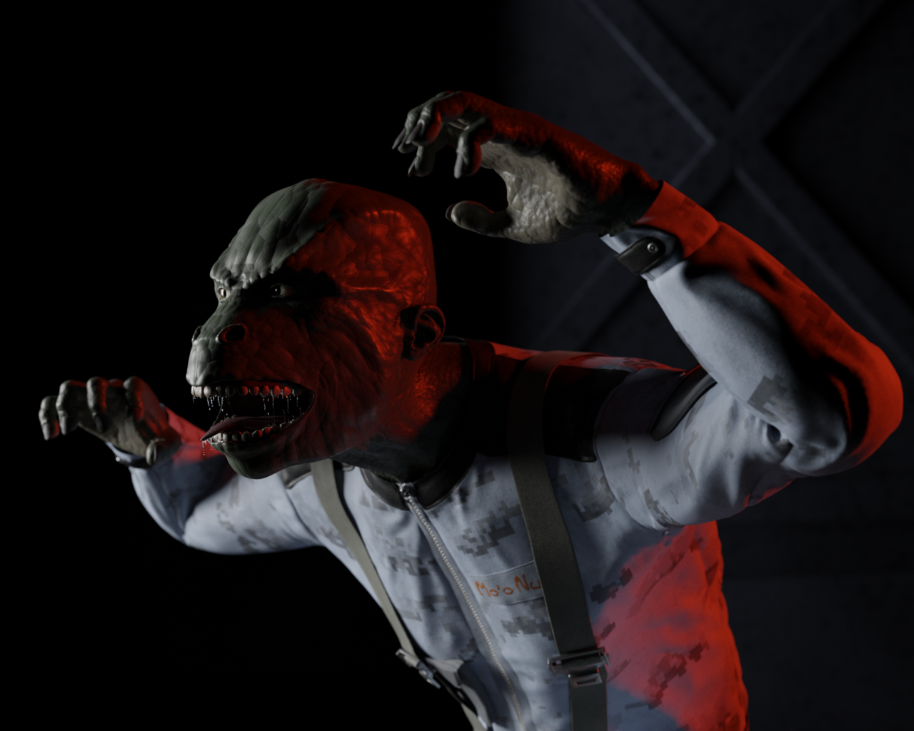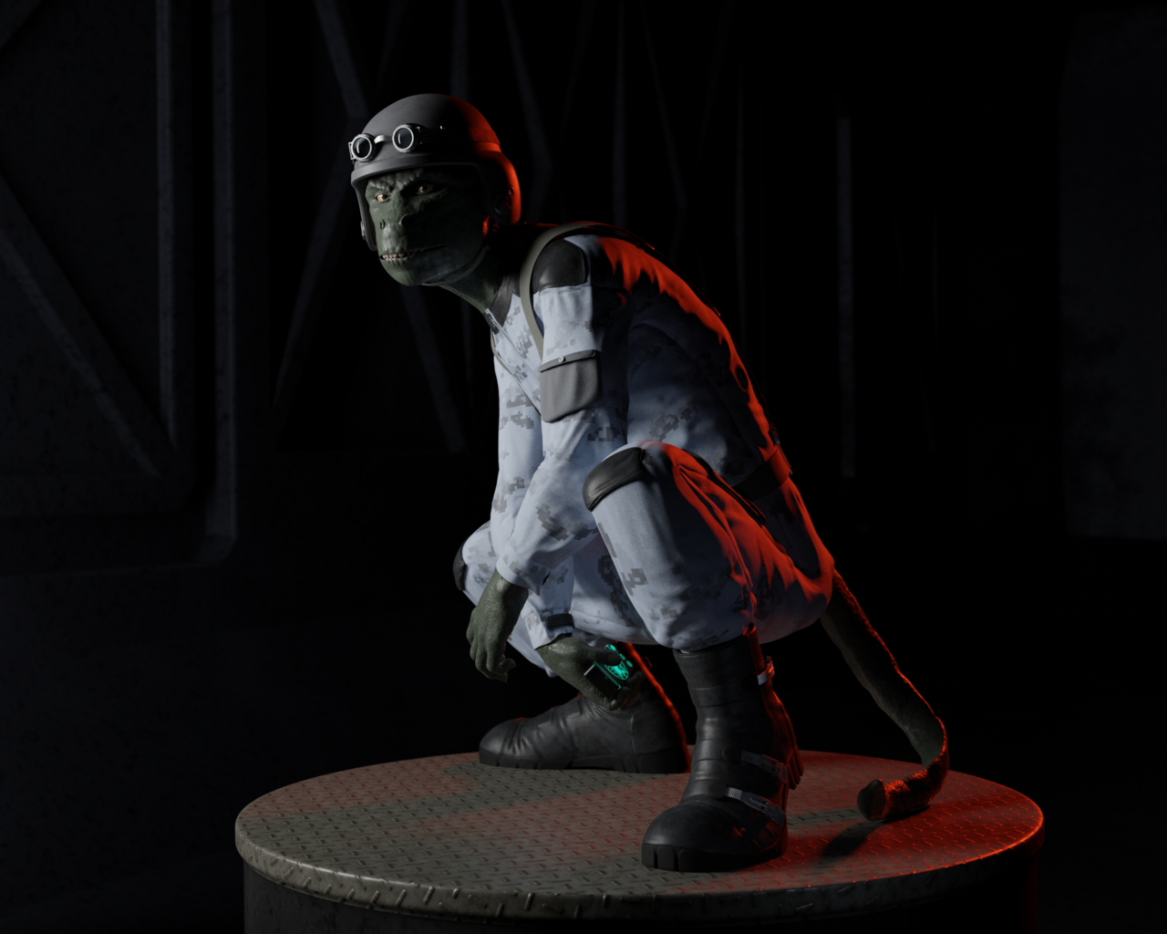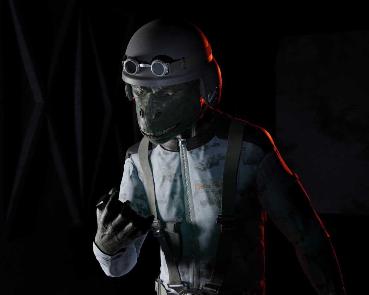 Even cooler, without the helmet he feels like a lizard mixed with a gorilla, he's a Gorizard. The first render looks cool with the pose and the attitude.