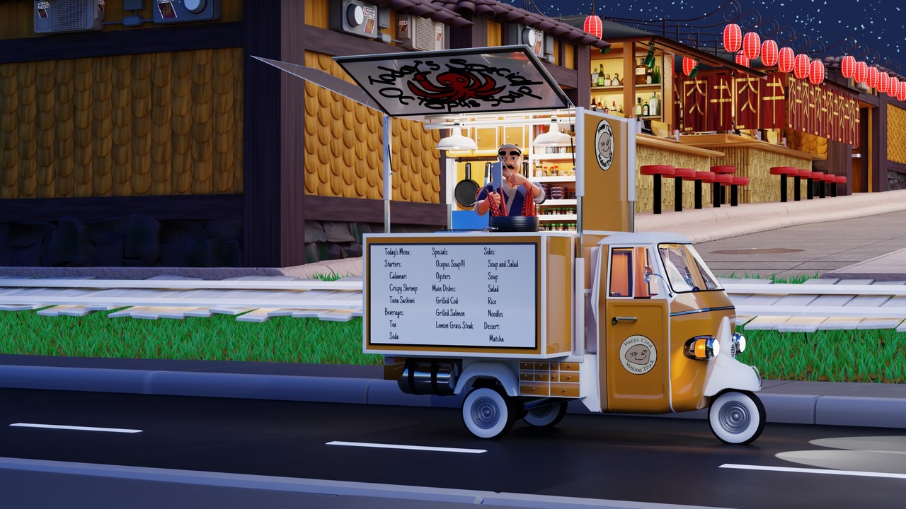 Now with white trim to because the chrome trim was difficult to see in the dark, and to add some obvious separation between the food truck and the orange wood of the buildings behind it.