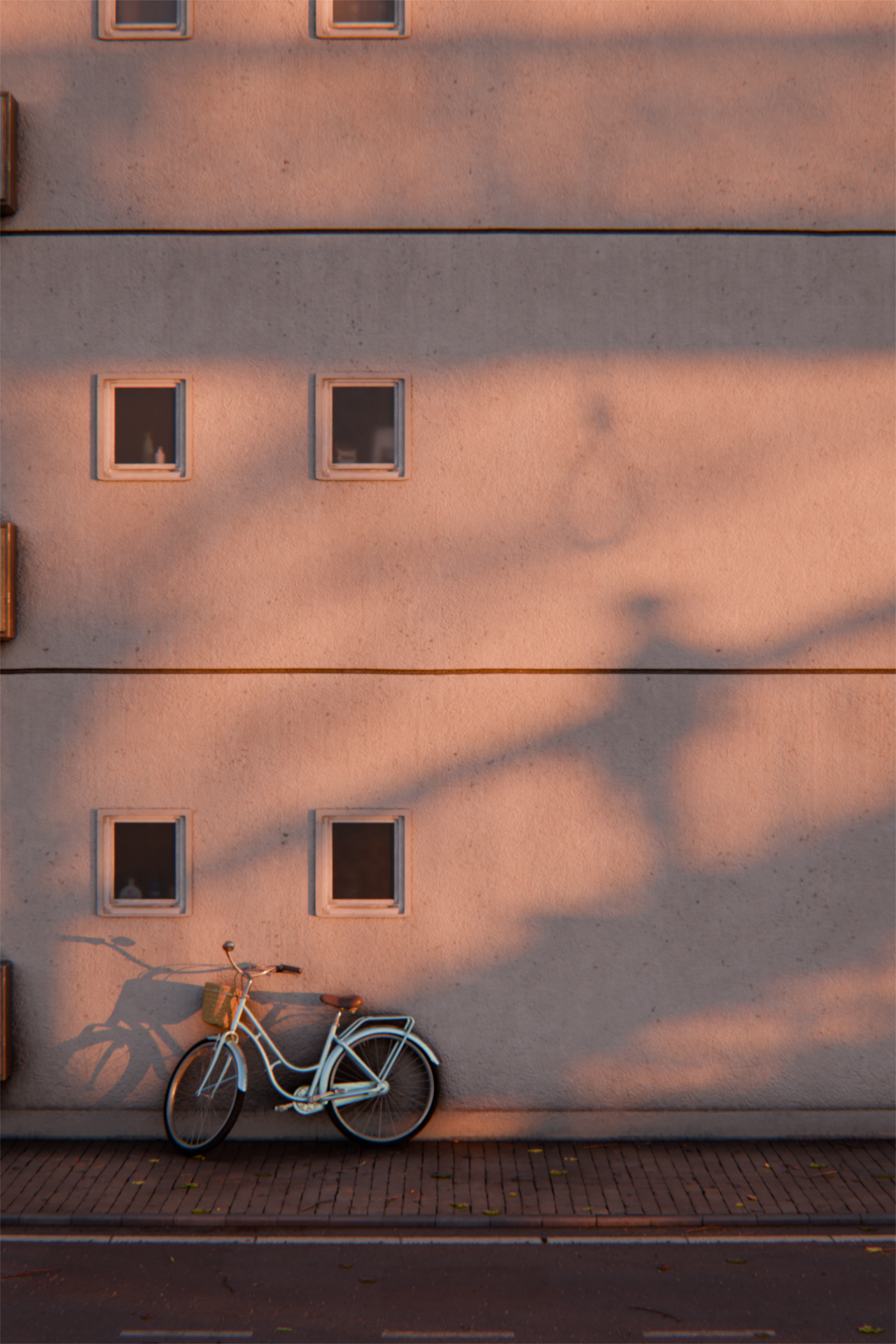 • I just had to look at some references to make sure my feeling on this was right... based on the low angle of the shadow and what feels like the coloring of the lighting on the wall, this feels like a sunrise or sunset time of day. I realize the bike is against the wall, so it's shadow would be sharper than the shadow of what is off camera, but it still feels a tad sharp to me for that low of an angle of a sunrise/sunset lighting, which is usually a bit weaker lighting than when the sun is up a bit higher. I guess I notice it because that's the strongest visual pull in the image -- the bike I mean, with the shadow of the staircase being a secondary eye rest. That shadow almost has me wondering what's going on off camera :D Also as I'm looking at references, I'm kind of wondering if maybe with the angle of the shadow being that low if the ighting should be a bit less overall and more orangey rather than purpleish red... but again, that could just be me overthinking things a bit.