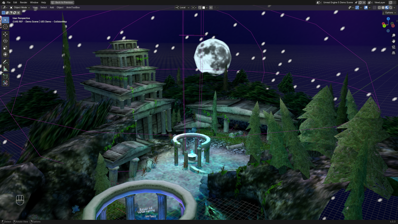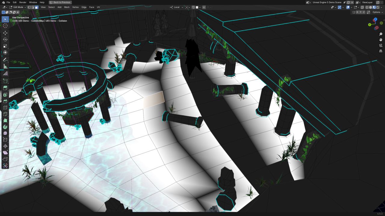 • Unreal engine mixes the layers then adds dynamic vertex lighting that I made with a mix of blueprints, Niagara general purpose GPU and microsoft directx HLSL shader. the unreal vertex lighting is a cut down version of the blender one and one of the few setups that ive run across that has virtually no limit to the amount of lights. the hard limit of lights that can be on at the same time is 1024 per layer with 8 layers (for effect masking)