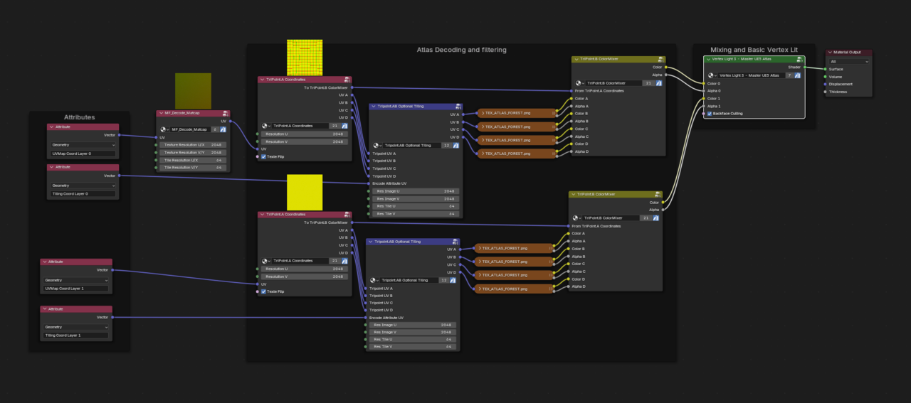 • in unreal engine I had to use HLSL to make my own texture samples capable of decoding the atlas coordinates for the tiling texture layers, this was a job and a half but it is done and compatible with mip-mapping without padding. foolishly i did not know this was a virtual texture system nor did i know that unreal has a built in one but now i have the blueprint that if i ever need to do this then i can do it many game engines, along with doing it with the custom tri point texture filtering.