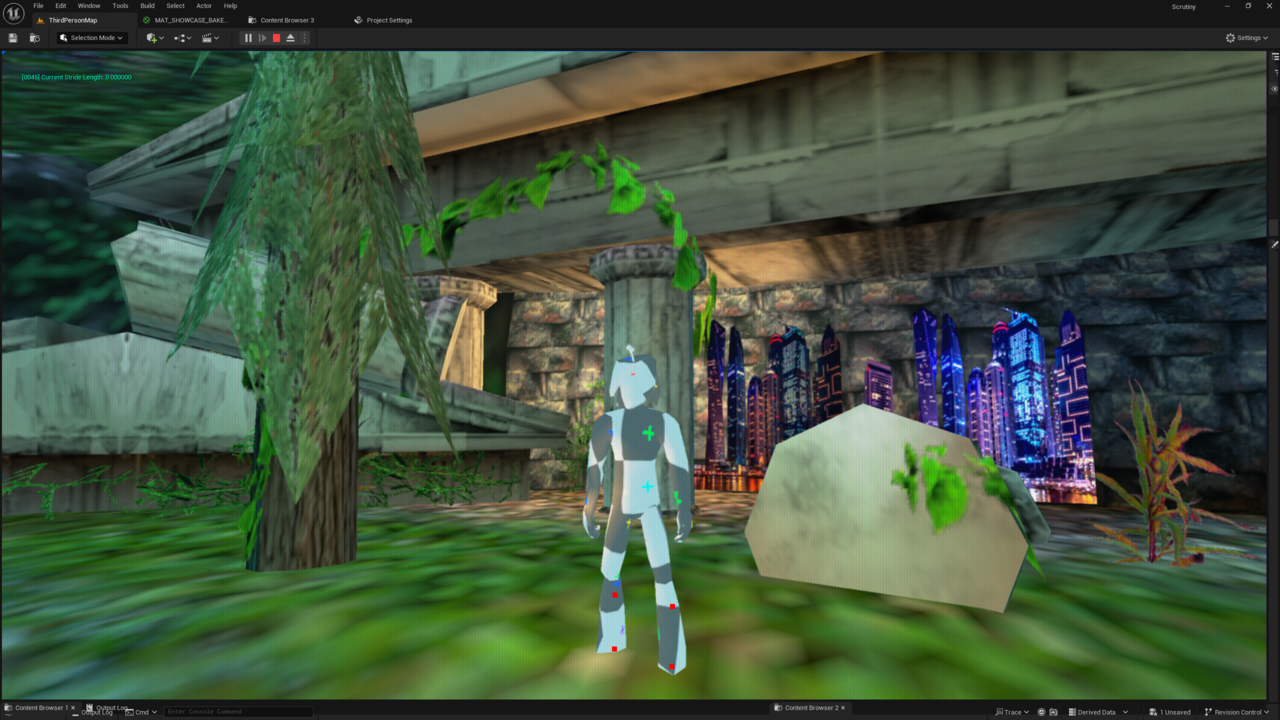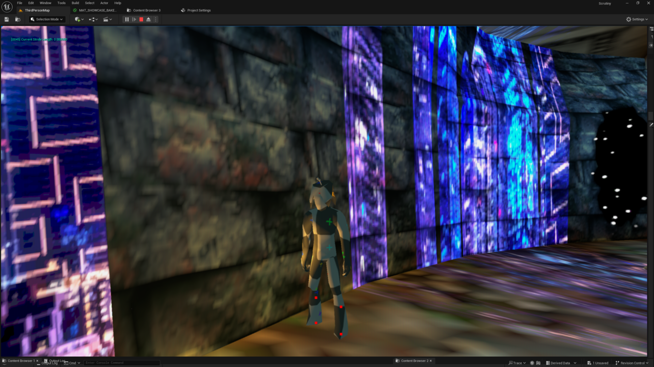 • a quirk of using UV channels for baked lighting. Unreal can use line traces to read UV data from a model, enabling me to draw a line from the characters feet and setting a base background color on the character. Note the two pictures, one of the test character standing out in the light of the forest and the second picture of the character standing in the shade next to the wall. this way ray traced shading from blender can cast the illusion of shadows in unreal. this could also be used in a stealth game to let a character be more or less visible to enemy NPCs.