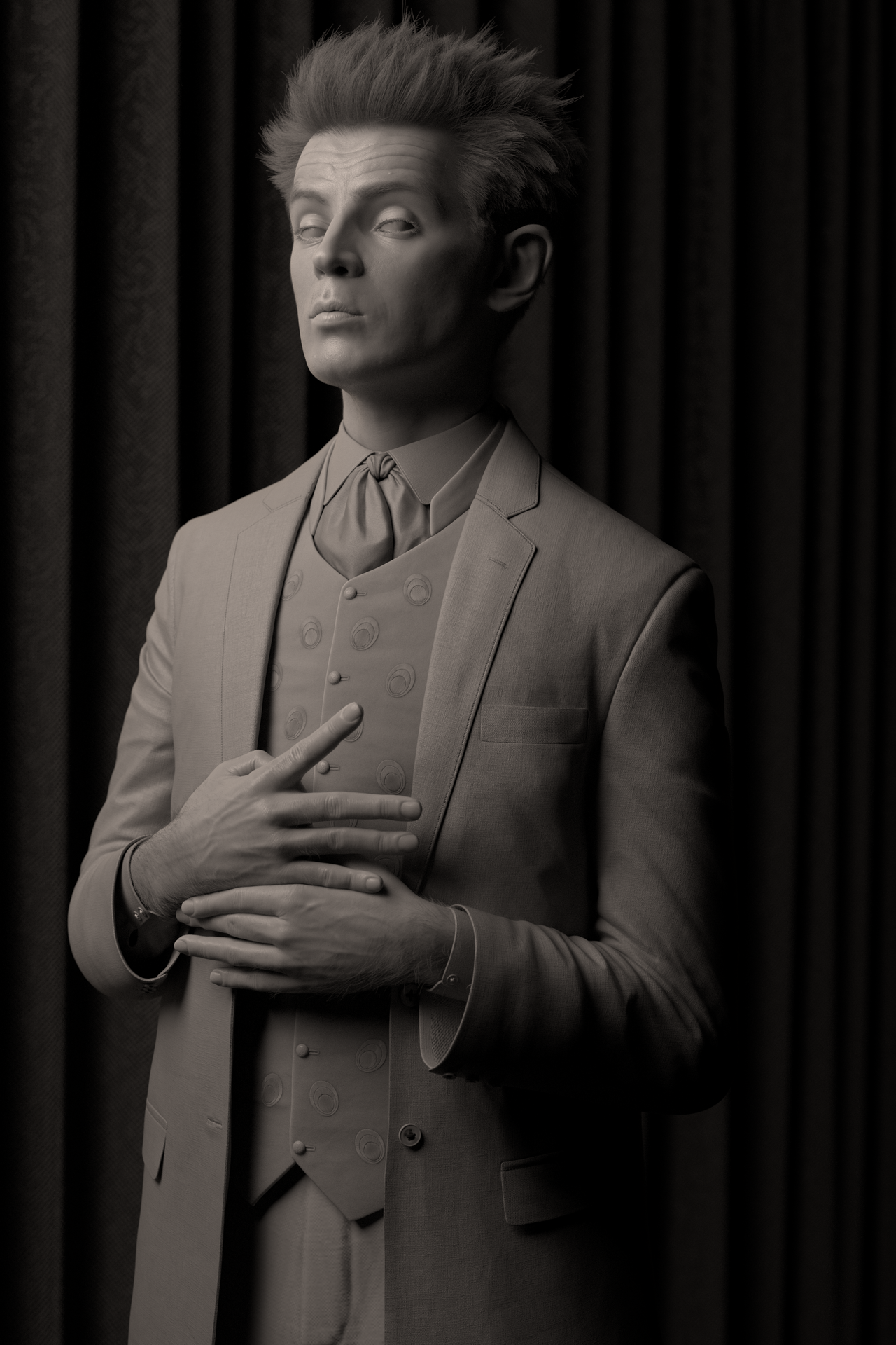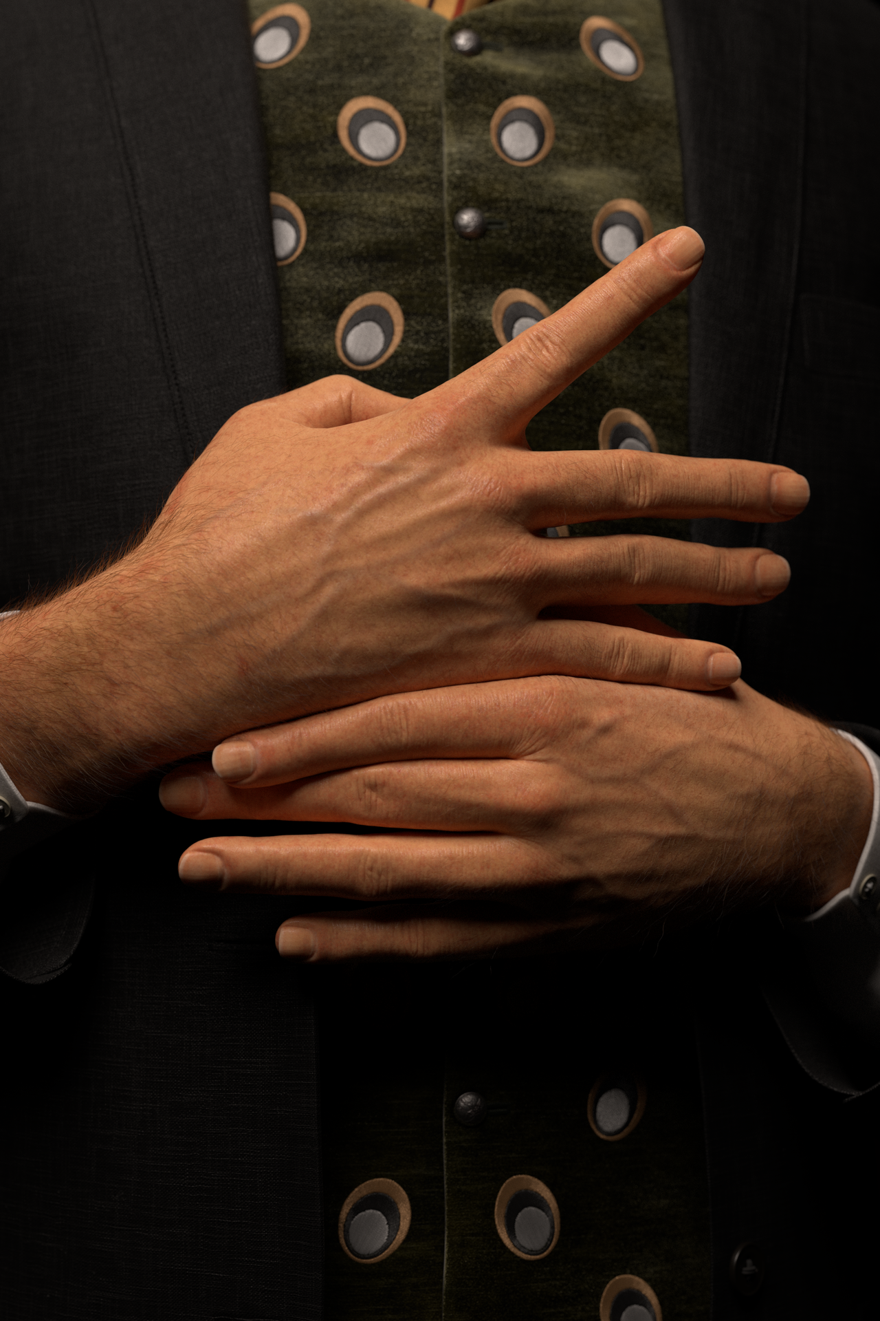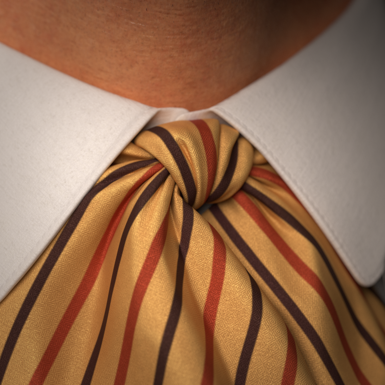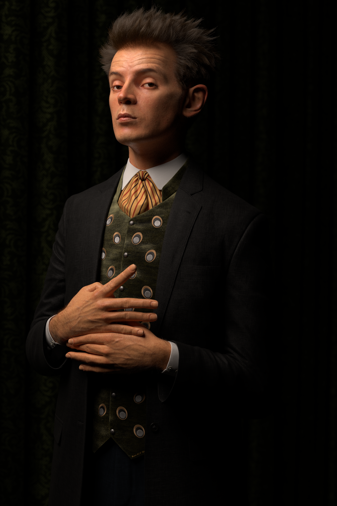 Love the detail in this! Almost curious... did you use a texture that already had a stripe patter on the tie or did you do that in Blender? And the stitched embellishments on the vest and the button... wow... very impressive! Won't be surprised at all to see this as a staff selection soon!