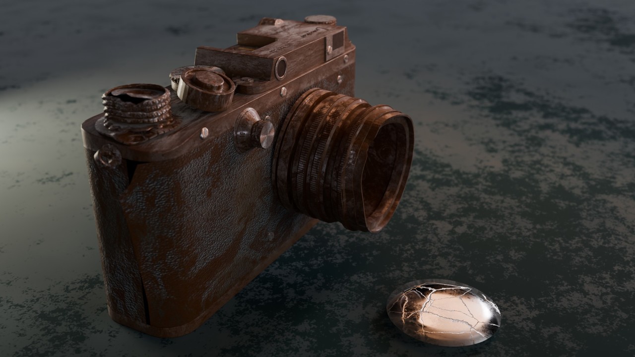 After dropping the camera I made in the Vintage Camera Course, I put it on a work table in the shop. I forgot about it until yesterday. I went into the shop and found it, right where I left it. It's a bit dusty and dirty now having sat for a few months. (Added dust and dirt courtesy of AgedFX addon).