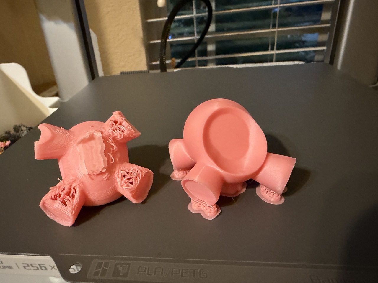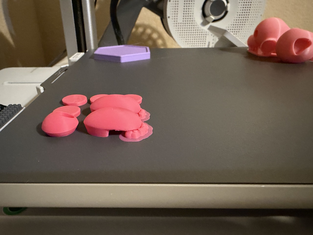 As you can see the body suffered from far too little surface contact while the filament layers were growing upwards towards the print head and it ended up pushing them down on a slight angle (like a cantilevered load) and caused the leg segments to topple over. On my second attempt I simply placed the legs on a raft. That worked but I wanted the printing process to go without needing special "per object settings", so I designed my own "raft" on the 3rd print attempt and that worked well. One of the videos covers the 3rd print attempt and takes you through the slicing process and shares a timelapse of the 3rd print.