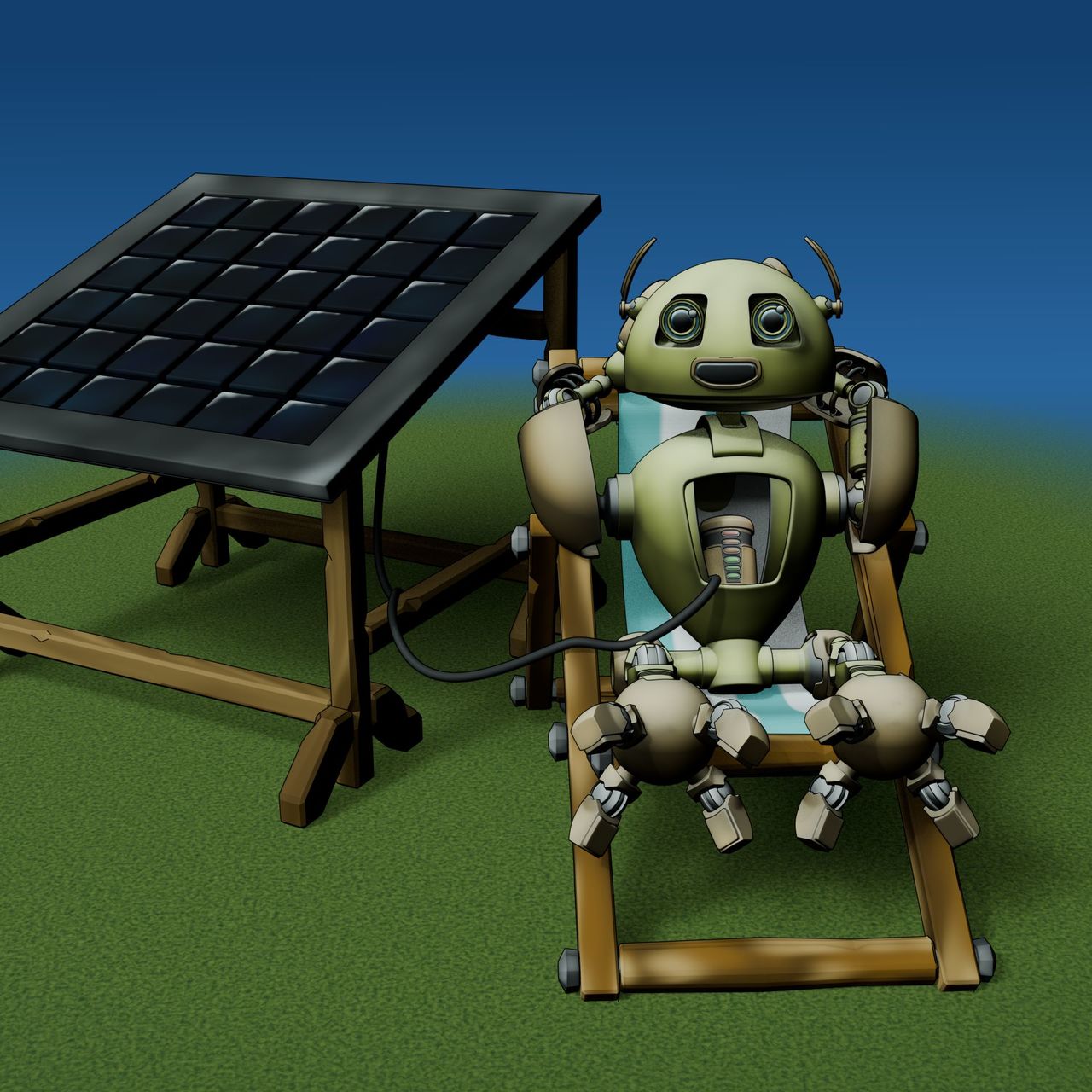 Robot relaxing in a deck/garden chair, recharging its battery from a nearby solar panel