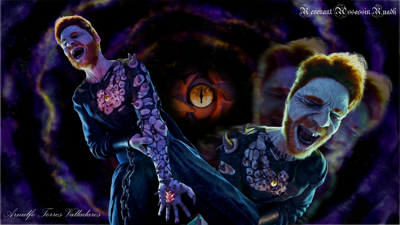 "Ruadh was an assassin in a sect that killed any and all enemies of the God of Light. This “God of Light” however was a God that demanded frequent sacrifices. Despite his being a faithful servant, Ruadh was betrayed by the sect, and offered as a sacrifice to the sect’s God. He resigned himself to die and was prepared to meet his God, but what was waiting for him on the other side was something far more horrifying. Some kind of evil God. This entity, feeling Ruadh’s anger, offered to send him back to the mortal world and give him the means to get his revenge, and Ruadh made the mistake of accepting. When Ruadh came back to life it was not at all what he expected. The evil God transformed his body giving him its own eye and placing it in the wound where he was stabbed, as well as its mouth in Ruadh’s hand so that he could devour the souls of his victims to feed his newfound God. The evil God, now a part of Ruadh’s body, exercises its influence on his mind, driving him towards complete and utter madness."