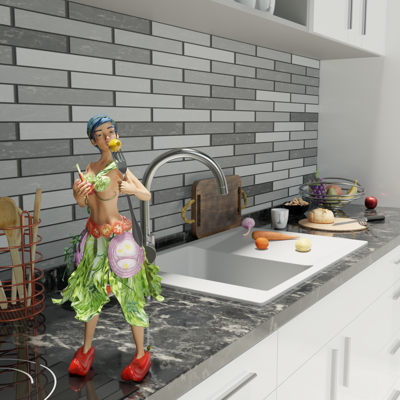 • Overall, I like this. Something I can relate to is that the character feels very thin in the body. (It's something I struggle with sometimes, too.) Legs feel a bit wide in the stance, though if the body were more properly proportioned, they might be in the right place or at least not as obviously wide in the stance. Her left foot also seems to be turned at a really odd angle. Love the detailing in the dress and hair!