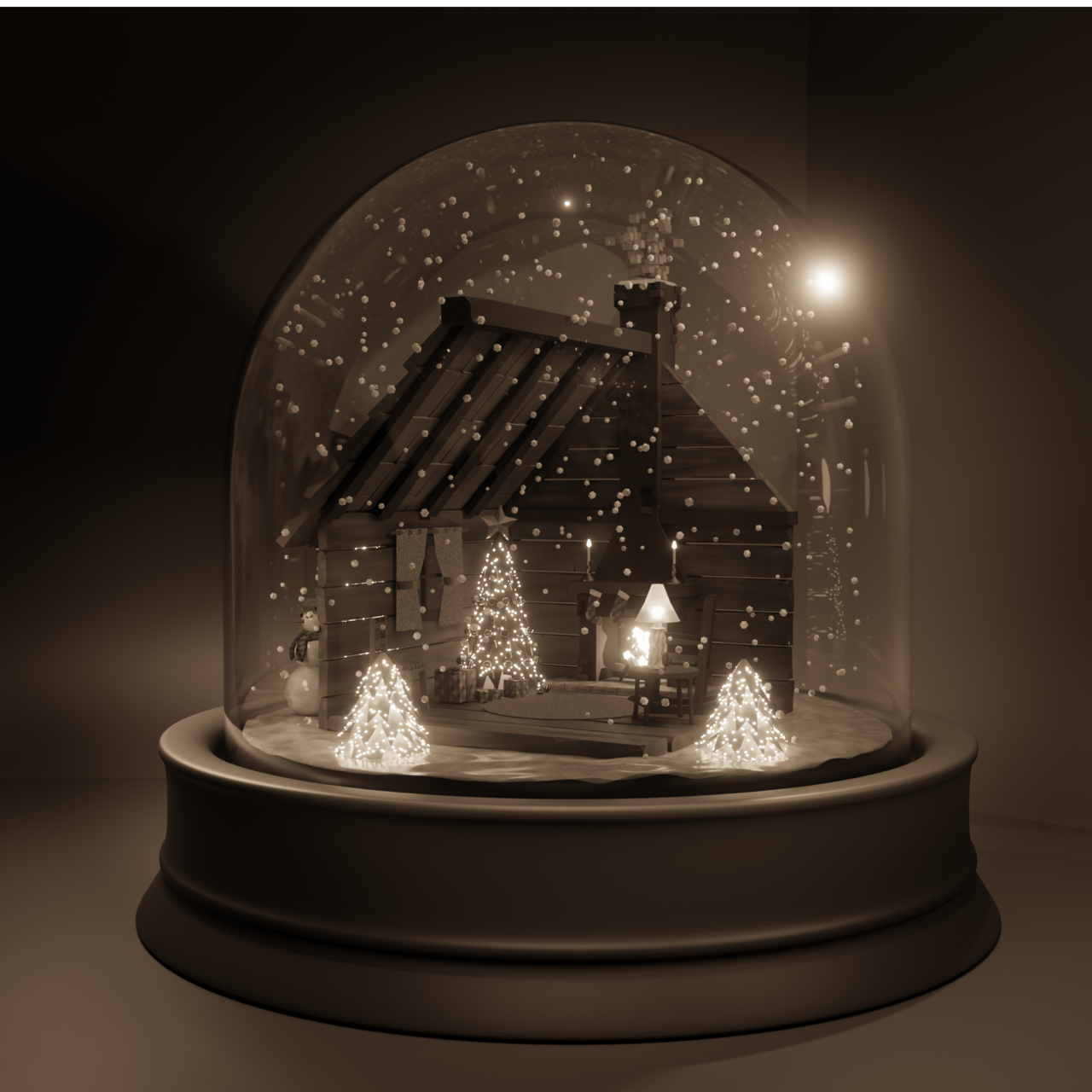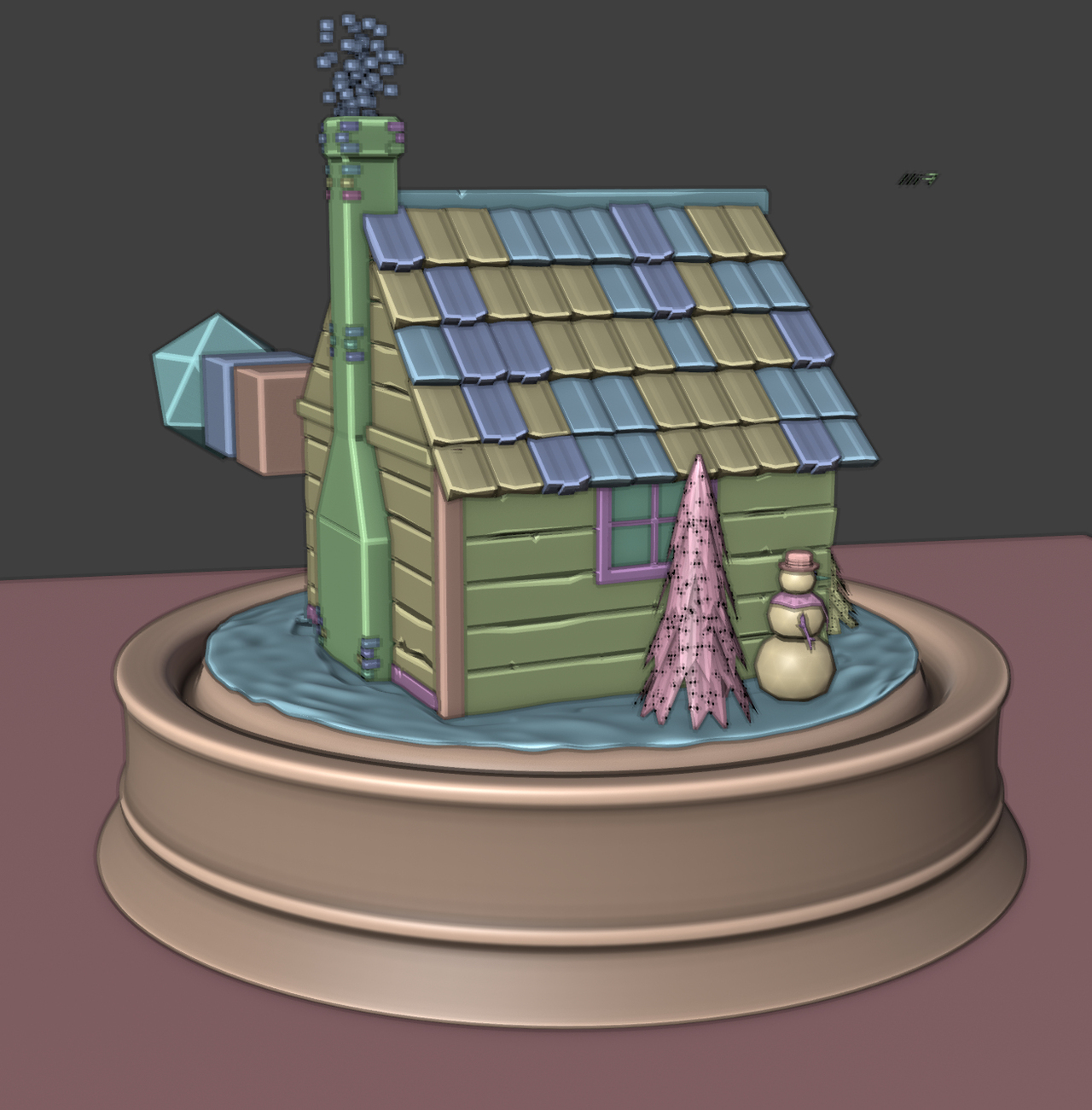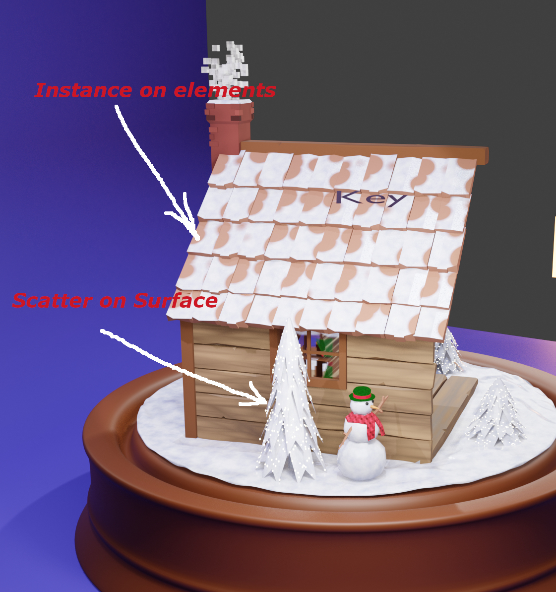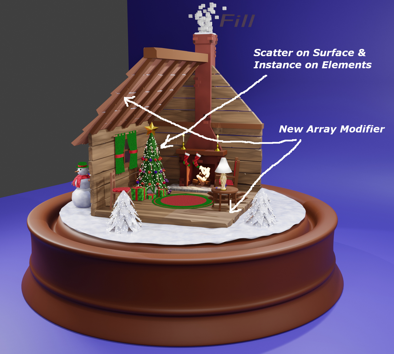 I took advantage of the new array with the ability to flip things randomly, the lights on the trees use the Scatter on Surface modifier and the shingles, tree ornaments and candy canes use the Instance on Elements modifier.