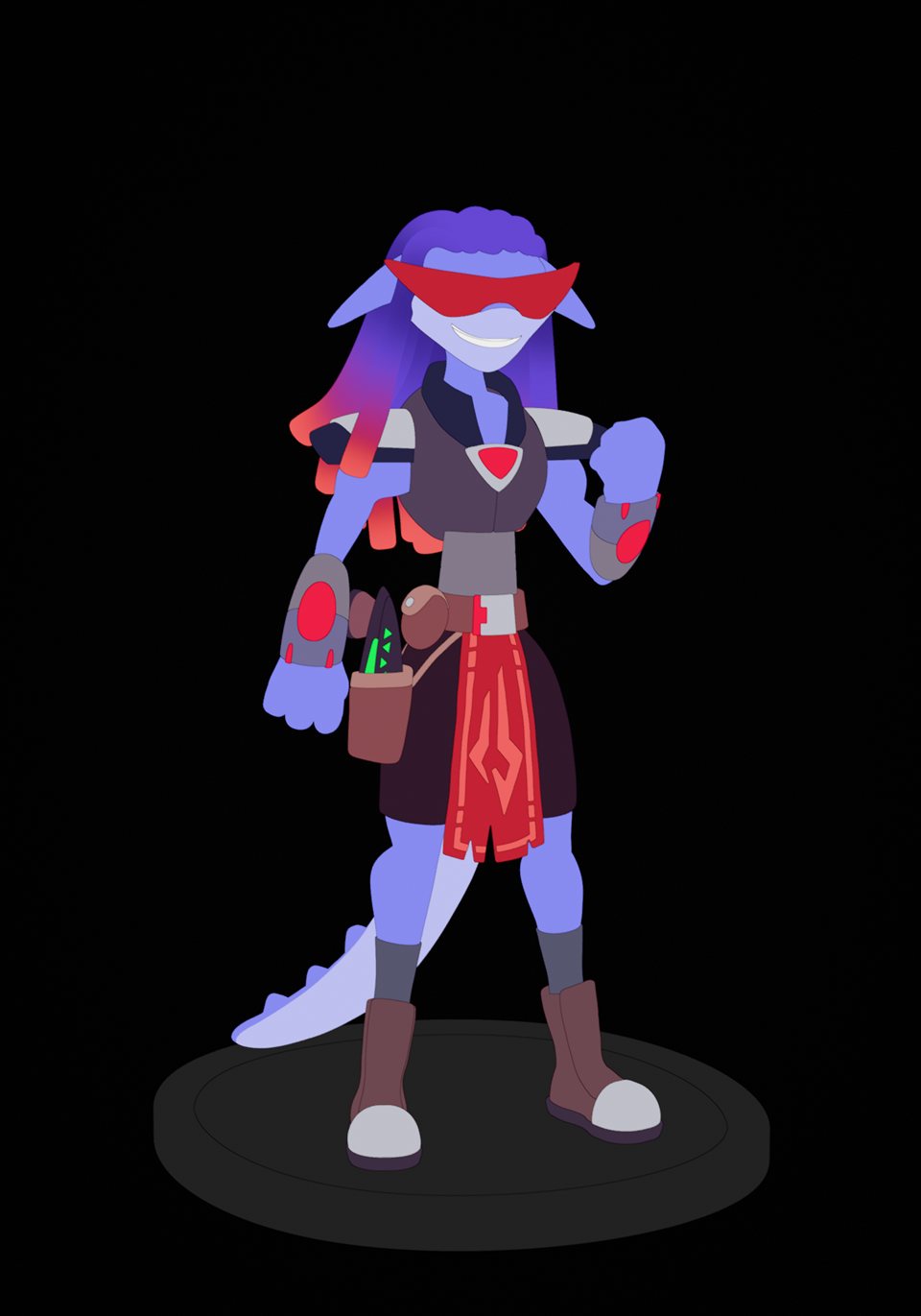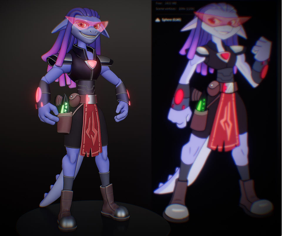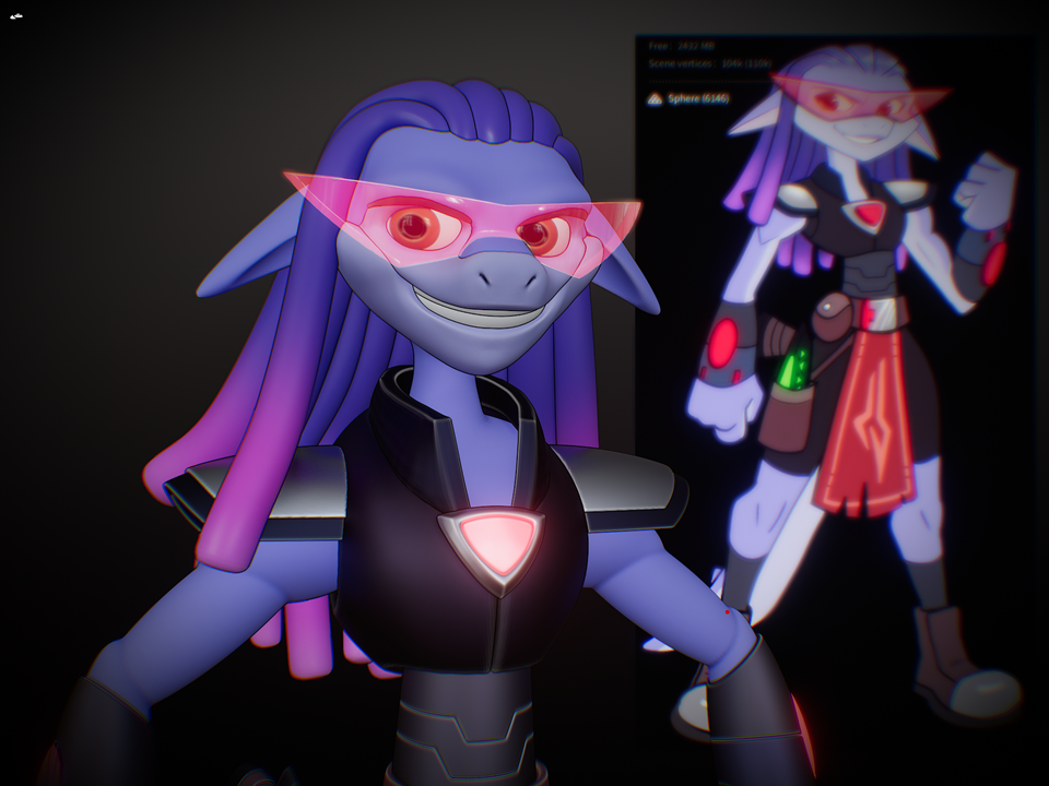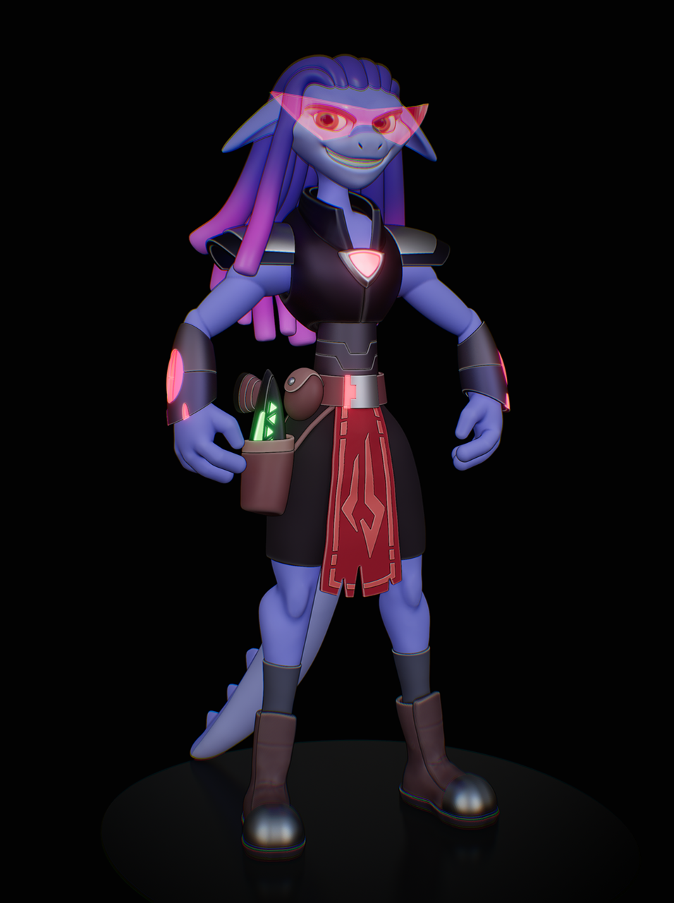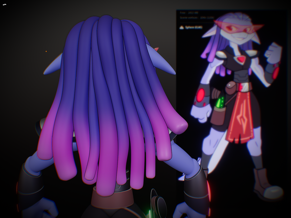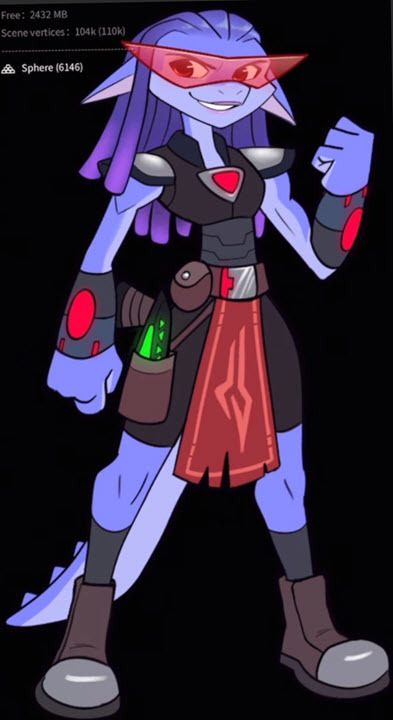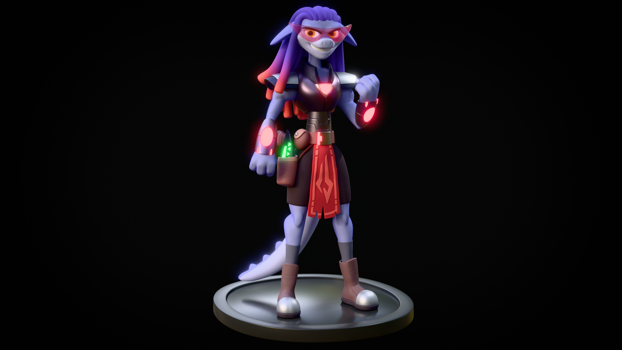 Additional materials and vertex painting; final shapes on glasses, arms, tail, eyes; Final Pose committed using Sculpt brushes; compositing and final render: Blender 5.0
