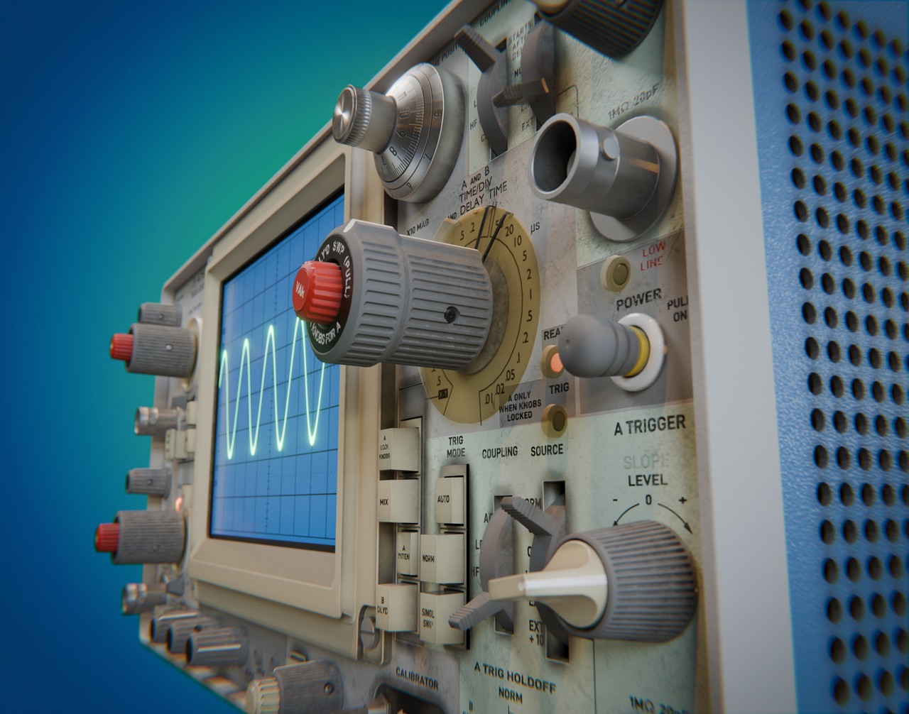 The screen is fantastic too. Using procedural textures for the grid and the curve was a great call, and honestly, it looks so good that it doesn’t even need to be plugged into anything 🤓 I used oscilloscopes a lot at university, and seeing one like this definitely brings back memories.